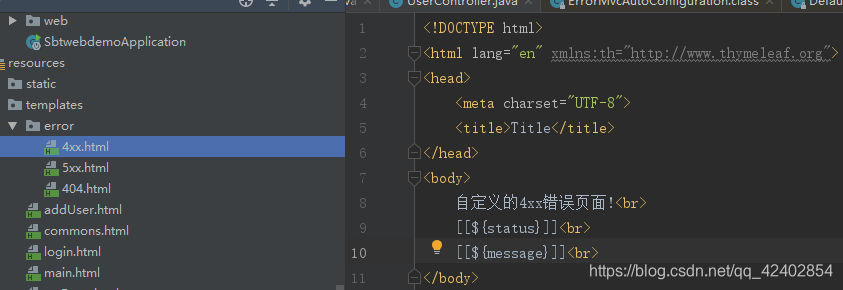 error/状态码 -- 将错误页面命名为 错误状态码.html 放在模板引擎文件夹里面的error文件夹下(/templates/error/xxx.html),发生此状态码的错误就会来到 对应的页面。使用4xx和5xx作为错误页面的文件名来匹配这种类型的所有错误,精确状态码优先。