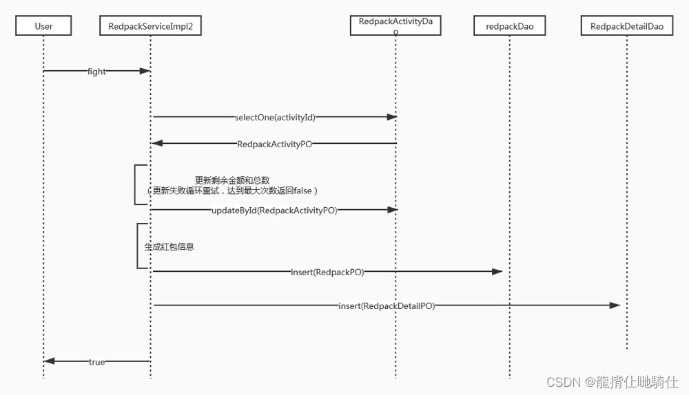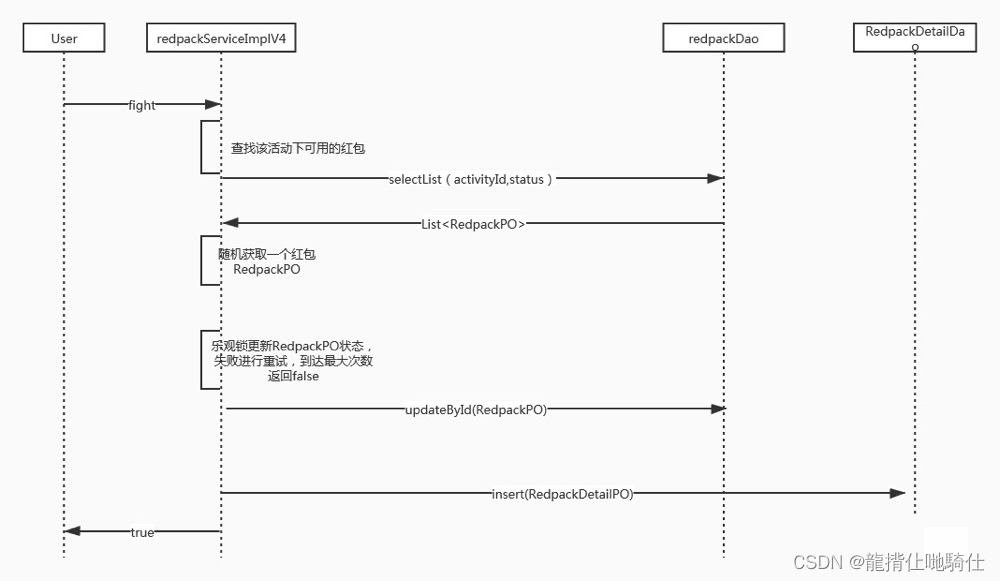 基于乐观锁的实现 第二种方式,为红包活动表增加乐观锁版本控制,当多个线程同时更新同一活动表时,只有一个clien会成功。其它失败的client进行循环重试,设置一个最大循环次数即可。此种方案可以实现并发情况下的处理,但是冲突很大。因为每次只有一个人会成功,其他client需要进行重试,即使重试也只能保证一次只有一个人成功,因此TPS很低。当设置的失败重试次数小于发放的红包数时,可能导致最后有人没抢到红包,实际上还有剩余红包。