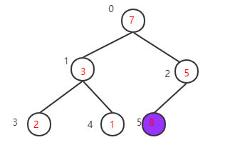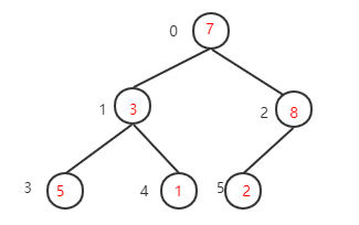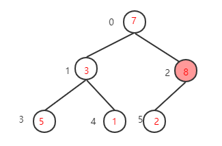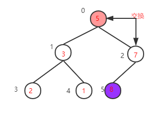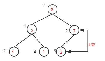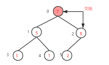 下一步,继续找到下一个非叶子节点1-1=0,该节点的值为7,大于其左子树的值,不需要交换,再看右子树,该节点的值小于右子树的值8,需要交换值