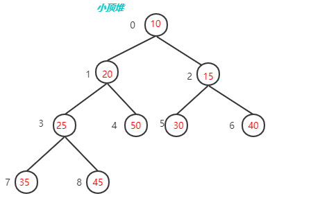 小顶堆 arr : 10 20 15 25 50 30 40 35 45