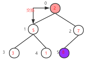 然后下一步交换根节点8与最后一个元素2交换位置(将最大元素"沉"到数组末端),此时最大的元素就归位了,然后对剩下的5个元素重复上面的操作