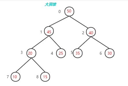 大顶堆 arr : 50 45 40 20 25 35 30 10 15