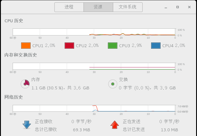 显示CPU历史,内存和交换历史,以及网络历史。能实时查看内存的使用情况,但是没能看到buffer和cache的使用情况。