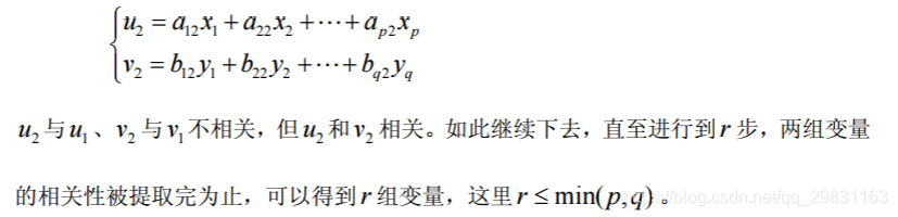 然后再在每组变量中找出第二对线性组合,使其分别与本组内的第一线性组合不相 关,第二对本身具有次大的相关性。