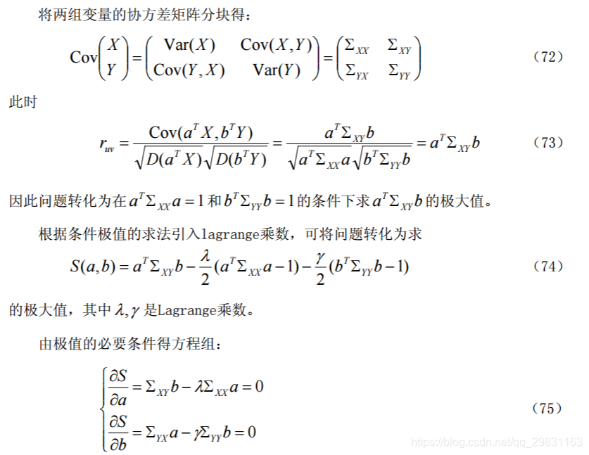 的相关关系,可以用最原始的方法,分别计算两组变量之间的全部相关系数,一共有 pq 个简单相关系数,这样又繁琐又不能抓住问题的本质。如果能够采用类似于主成分的思 想,分别找出两组变量的各自的某个线性组合,讨论线性组合之间的相关关系,则更简捷。 首先分别在每组变量中找出第一对线性组合,使其具有最大相关性,
