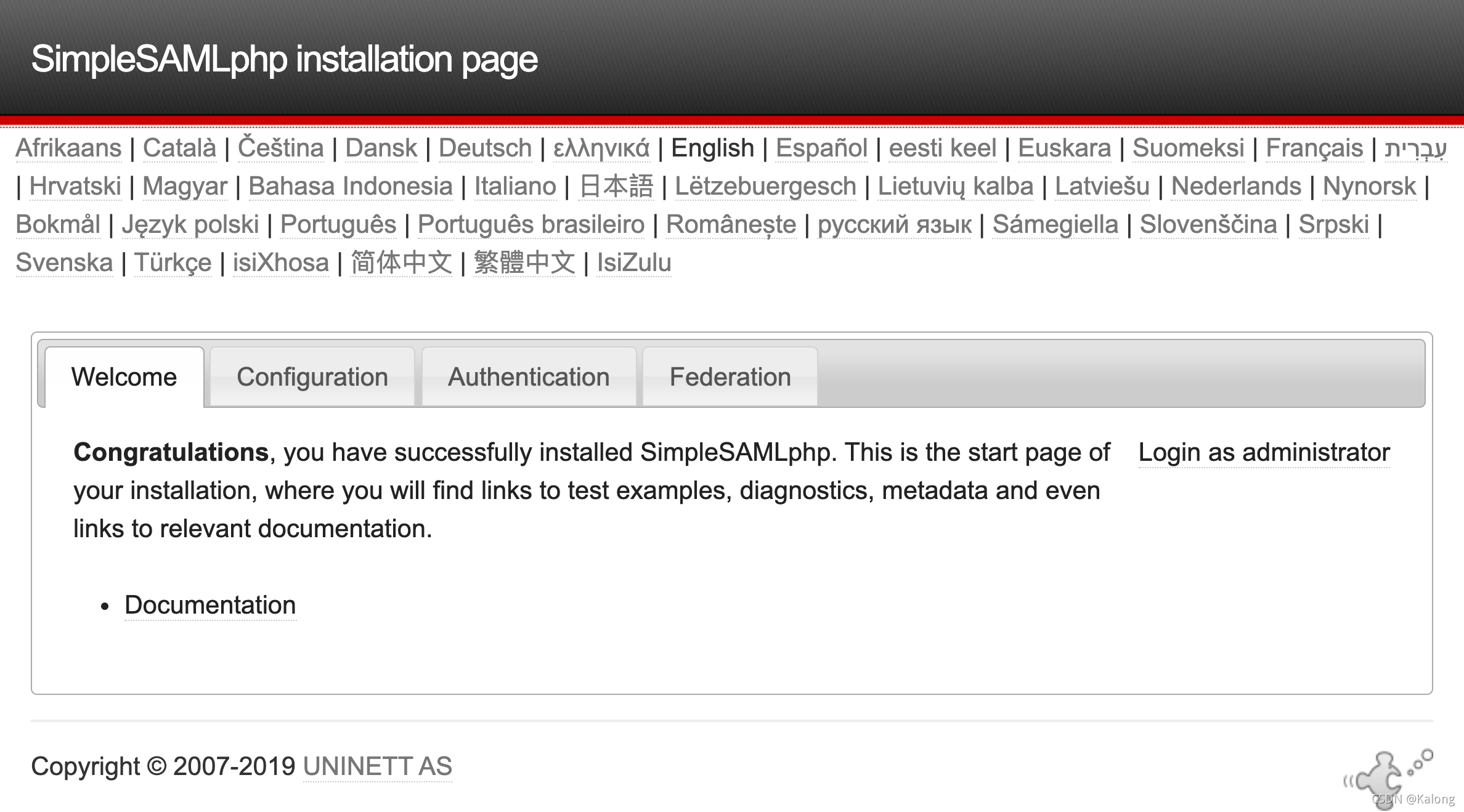 To make sure your PHP installation meets all requirements for SimpleSAMLphp to run smoothly, select the Configuration tab and click on the Login as administrator link. Then use the administrator password you set in the configuration file in Step 3.