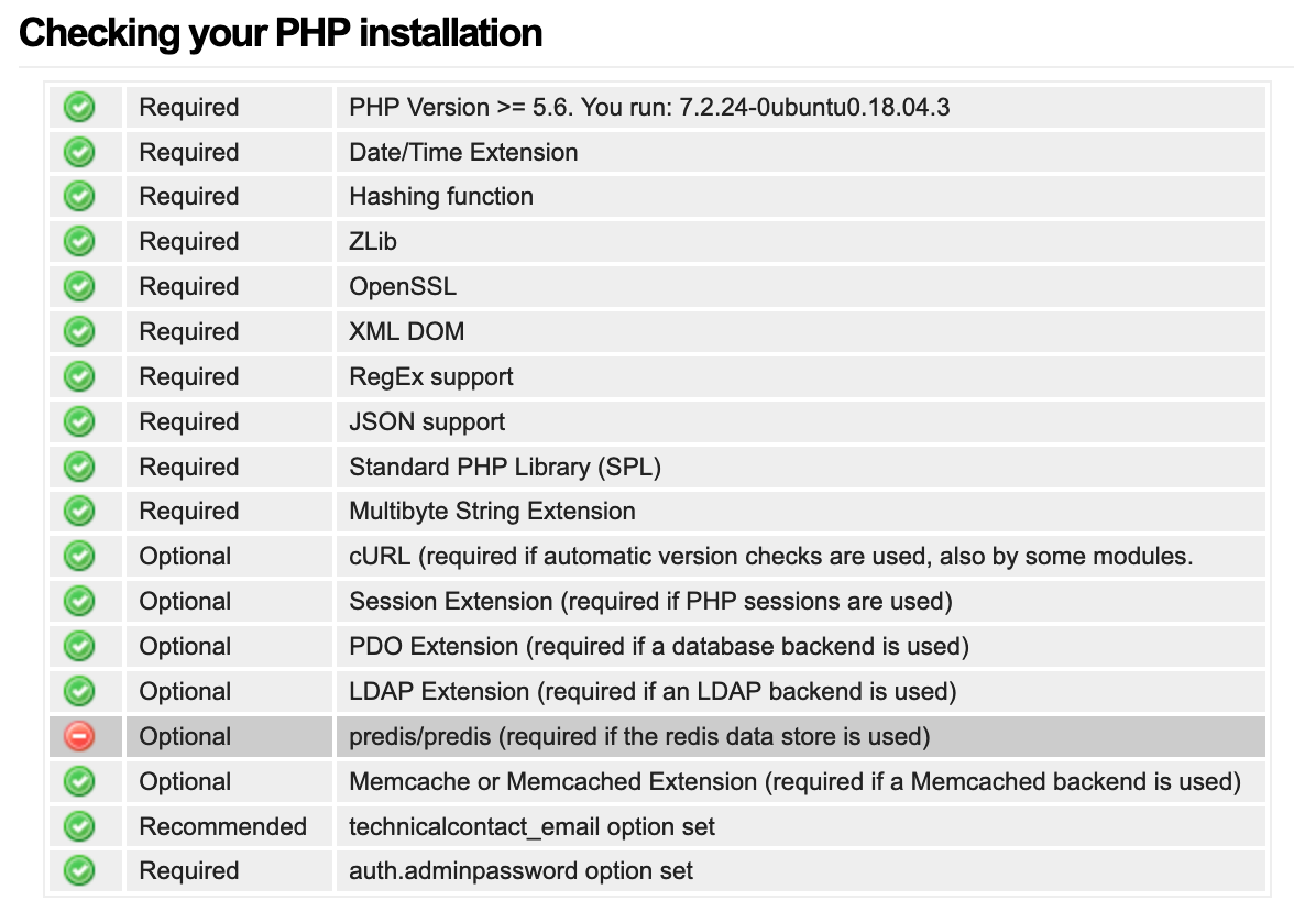 Once logged in, you’ll see a list of required and optional PHP extensions used by SimpleSAMLphp. Check that you have installed every extension except predis/predis: