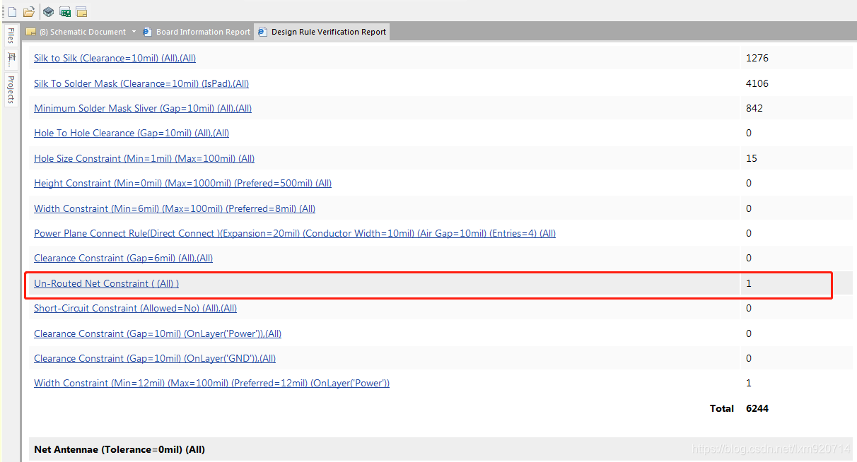 找到报告中的Un-Routing Net Consrtaint(All)项,这里显示你没有布线的网络数目,