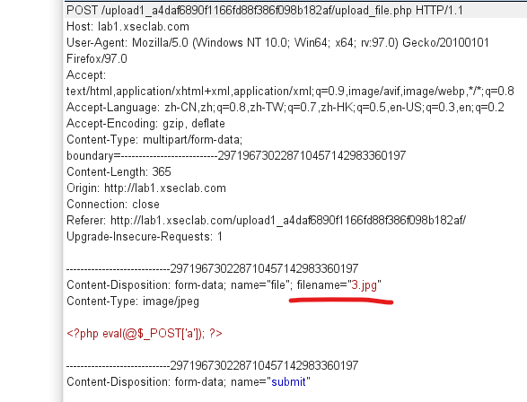 可知绕过前端JS验证才可得到flag,可将事先准备好的一句话木马的文件后缀改成jpg,随后用bp抓包