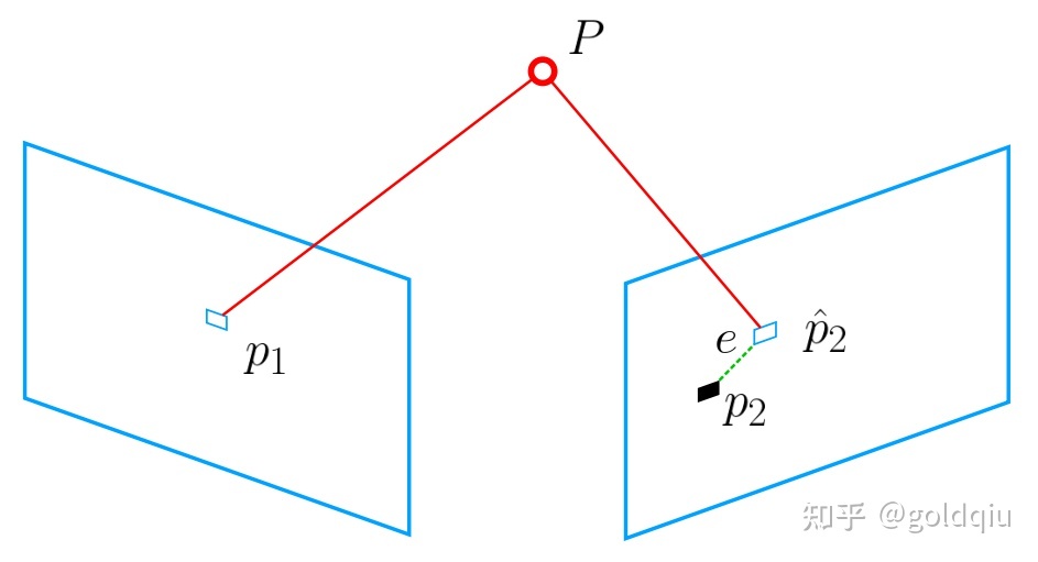 如图所示,通过特征匹配,知道了 p1 和 p2 是同一个空间点 P 的投影,但是不知道相机的位姿。在初始值中,P 的投影 pˆ2 与实际的 p2 之间有一定的距离。于是调整相机的位姿,使得这个距离变小。不过,由于这个调整需要考虑很多个点,所以最后每个点的误差通常都不会精确为零。