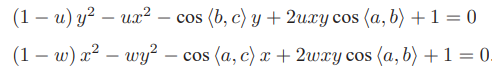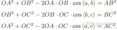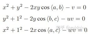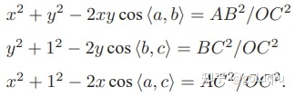 由于知道 2D 点的图像位置,三个余弦角 cos〈a, b〉, cos〈b, c〉, cos〈a, c〉 是已知的。同时,