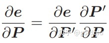 另一方面,除了优化位姿,还希望优化特征点的空间位置。因此,需要讨论 e 关于空间点 P 的导数。仍利用链式法则,有: