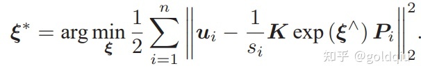 中间隐含着齐次坐标到非齐次的转换,否则按矩阵的乘法来说,维度是不对的。因为exp (ξ∧) Pi 结果是 4 × 1 的,而它左侧的 K 是 3 × 3 的,所以必须把 exp (ξ ∧) Pi 的前三维取出来,变成三维的非齐次坐标。 现在,由于相机位姿未知以及观测点的噪声,该等式存在一个误差。因此把误差求和,构建最小二乘问题,然后寻找最好的相机位姿,使它最小化: