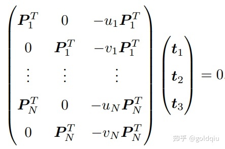 t 是待求的变量,可以看到每个特征点提供了两个关于 t 的线性约束。假设一共有 N 个特征点,可以列出线性方程组: