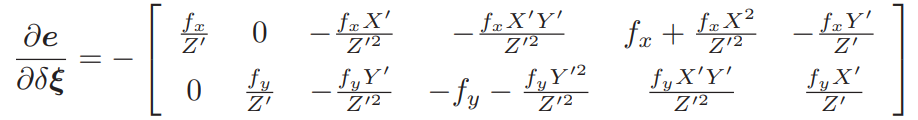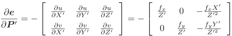 这里的⊕指李代数上的左乘扰动。第一项是误差关于投影点的导数,得: