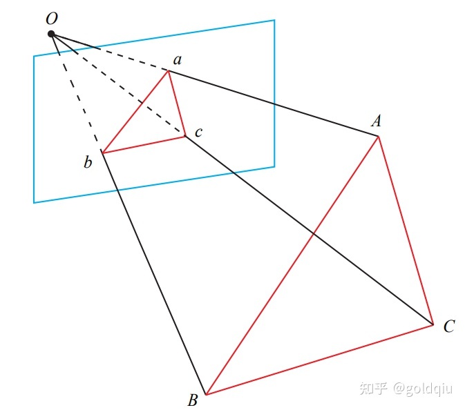 P3P仅使用三对匹配点,对数据要求较少,需要利用给定的三个点的几何关系。它的输入数据为三对 3D-2D 匹配点。记 3D 点为 A, B, C,2D 点为 a, b, c,其中小写字母代表的点为大写字母在相机成像平面上的投影,如图所示。