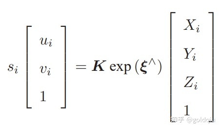考虑 n 个三维空间点 P 和它们的投影 p,希望计算相机的位姿 R, t,它的李代数表示为 ξ。假设某空间点坐标为 Pi = [Xi , Yi , Zi ]T,其投影的像素坐标为 ui = [ui , vi ]T。 像素位置与空间点位置的关系如下: