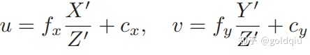这与相机模型是一致的。当求误差时,可以把这里的 u, v 与实际的测量值比较,求差。定义了中间变量后对 ξ∧左乘扰动量δξ,然后考虑 e 的变化关于扰动量的导数。利用链式法则,可以列写如下: