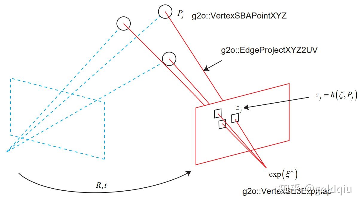 - 边:每个 3D 点在第二个相机中的投影,以观测方程来描述: zj = h(ξ, Pj ).
