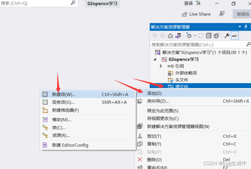 然后用个测试代码进行测试看能否运行,在解决方案资源管理器中,点击源文件,添加新建项,