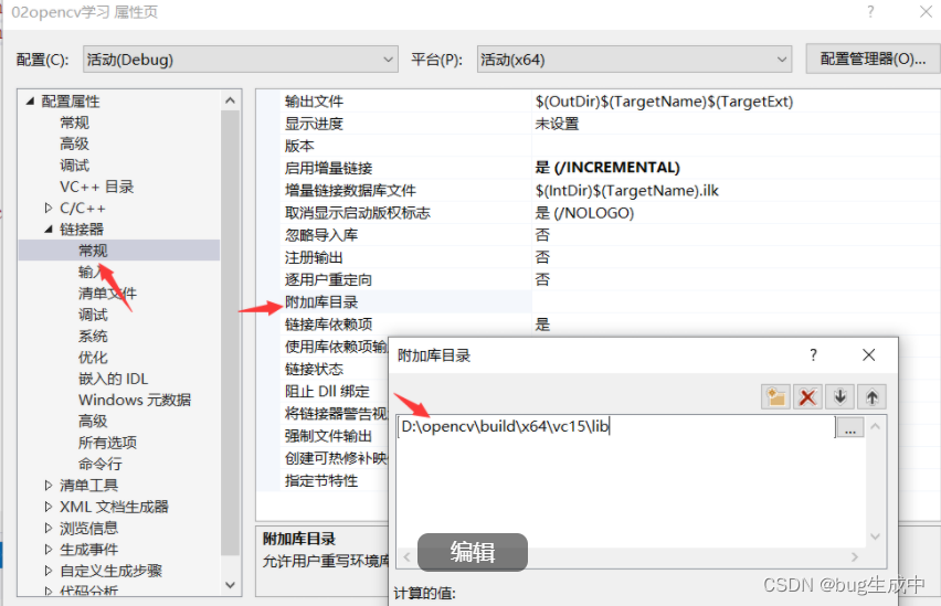 我们可以在链接器,常规中添加附加库目录,路径D:\opencv\build\x64\vc15\lib