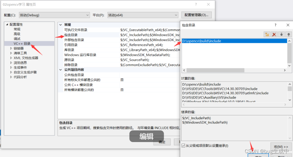 在其中找到VC++ 目录 点击包含目录 编辑添加路径 D:\opencv\build\include