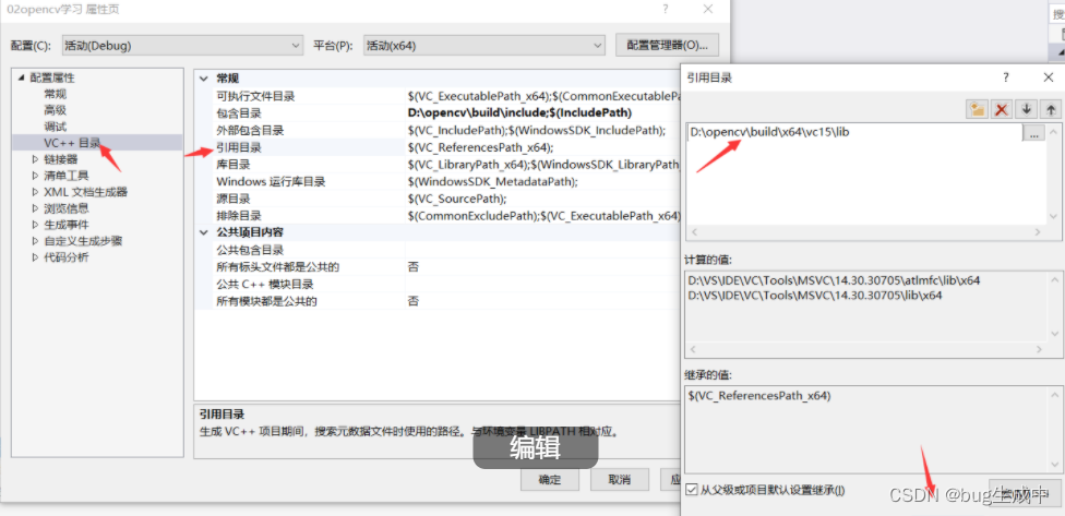 然后在VC++ 目录 点击引用目录 编辑添加路径 D:\opencv\build\x64\vc15\lib