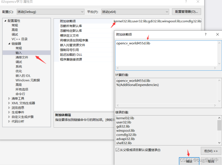 然后在链接器中,附加依赖项中编辑加入名称,opencv_world455d.lib(根据自己下载的opencv版本调整)一般是vs15文件夹下的opencv_world455d.dll后缀名dll变为lib