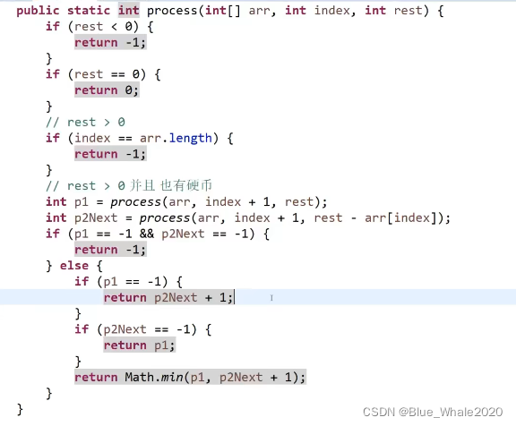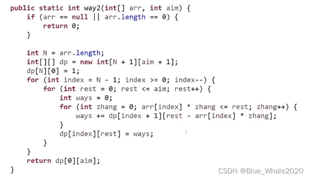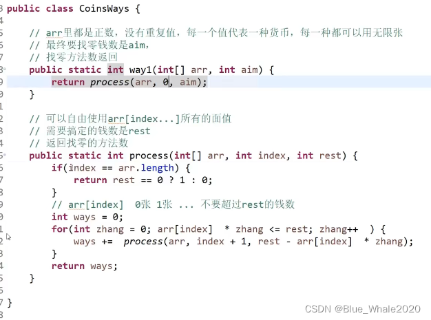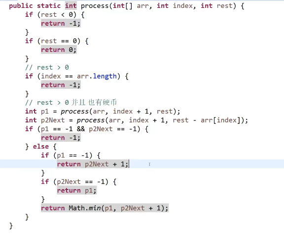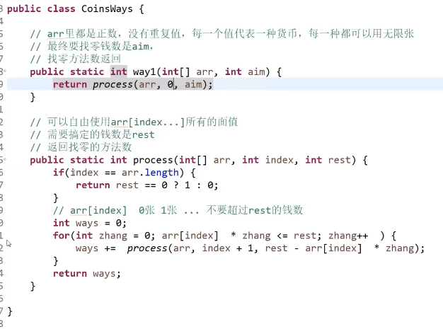 1:19: 给定一个数组,里面所有的数值都是正数,每一个位置的值代表一个面值的货币,一个面值代表可以使用任意张,要组出一个钱数,问方法数有多少种。这是在一个递归里面。使用for循环多次迭代下层递归的例子