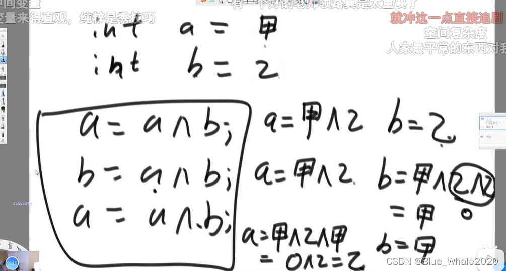33:00 亦或运算可以理解为无进位相加,0亦或A 等于 A ,A亦或A等于0,36:00 不适用额外变量交换两个数