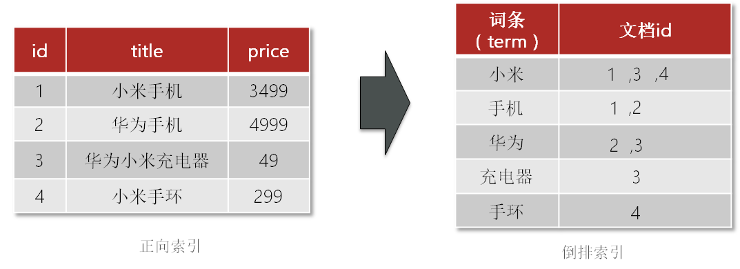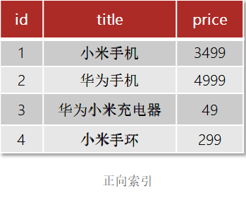 传统数据库(如MySQL)采用正向索引,例如给下表(tb_goods)中的id创建索引: