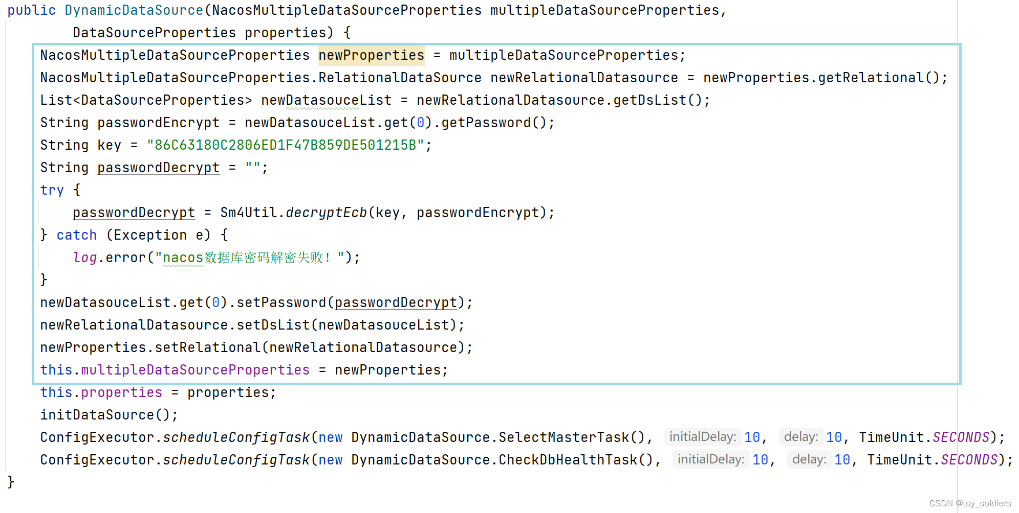 --解决:经过代码排查发现,在本工程中。数据库的装载是在nacos-config模块下com.alibaba.nacos.config.server.configuration.datasource包下的DynamicDataSource类的构造函数中完成的,所以我们尝试在这里进行修改,修改后如下图所示