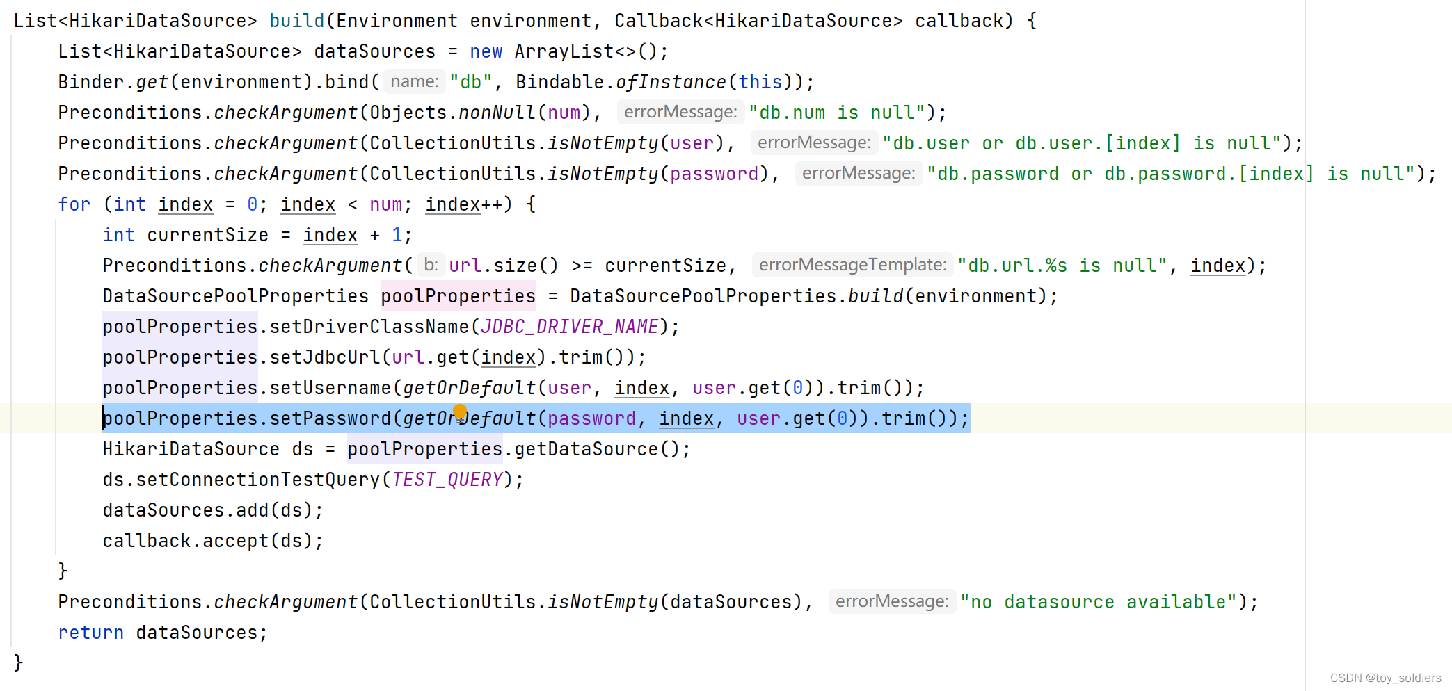 --探索:网上关于nacos数据源加密的文章没有很多,大部分都是说修改nacos-config模块下com.alibaba.nacos.config.server.service.datasource包下的ExternalDataSourceProperties文件,对build()方法进行修改,如下图修改poolProperties.setPassword(getOrDefault(password, index,user.get(0)).trim());即可,对获取到的password进行解密再设置到poolProperties(当然同时在配置文件中对密码加密)。