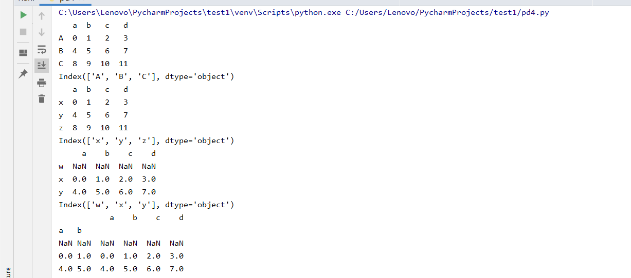 - reindex指定新索引,其实是在原索引中取出对应存在的行作为新的行,原索引中未出现的,对应列的数据均赋值为NaN