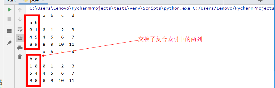 有时需要重新调整某条轴上各级别的顺序,或根据指定级别上的值对数据进行排序。swaplevel接受两个级别编号或名称,并返回一个互换了级别的新对象(但数据不会发生变化):