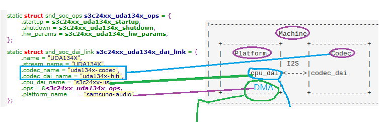 app -> 音频数据写入DMA buffer -> platform 通过I2S 将音频数据发给codec-> codec进行DAC转换-> 驱动扬声器发声。