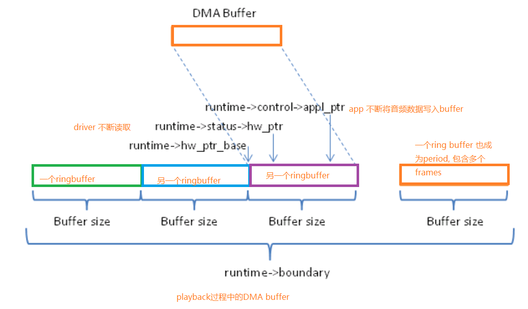 snd_pcm_runtime.hw_ptr_base: 环形缓冲区每一圈的基地址,当读写指针越过一圈后,它按buffer size进行移动;