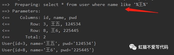 public interface UserDao { ListfindByName(String name);}<select id="findByName" parameterType="String" resultType="com.zhu.pojo.User"> select * from user where name like #{username}select>@Test public void testfindbyname() throws Exception { SqlSession sqlsession = MybatisUtils.getsqlsession(); UserDao userdao = sqlsession.getMapper(UserDao.class); List users = userdao.findByName("%王%"); for (User user : users) { System.out.println(user); } }