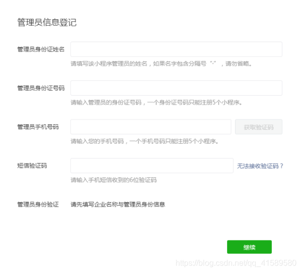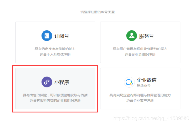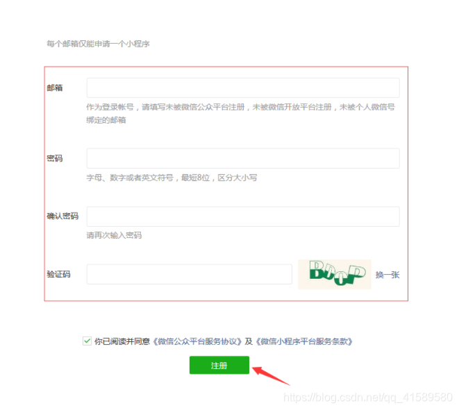 填写邮箱和密码。注意要使用没有注册过公众平台(小程序、公众号)、开放平台,没有绑定过个人微信号的邮箱 ;