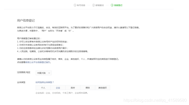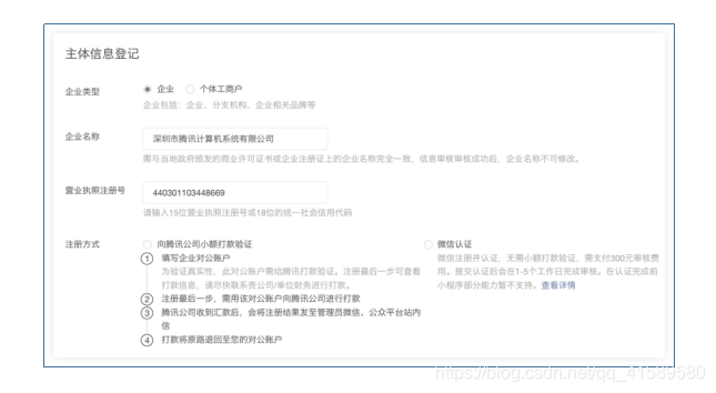 填写主体信息并选择验证方式,选择企业,注册方式:打款验证/微信认证。 如果需要开通微信支付功能,注册方式请选择微信认证。