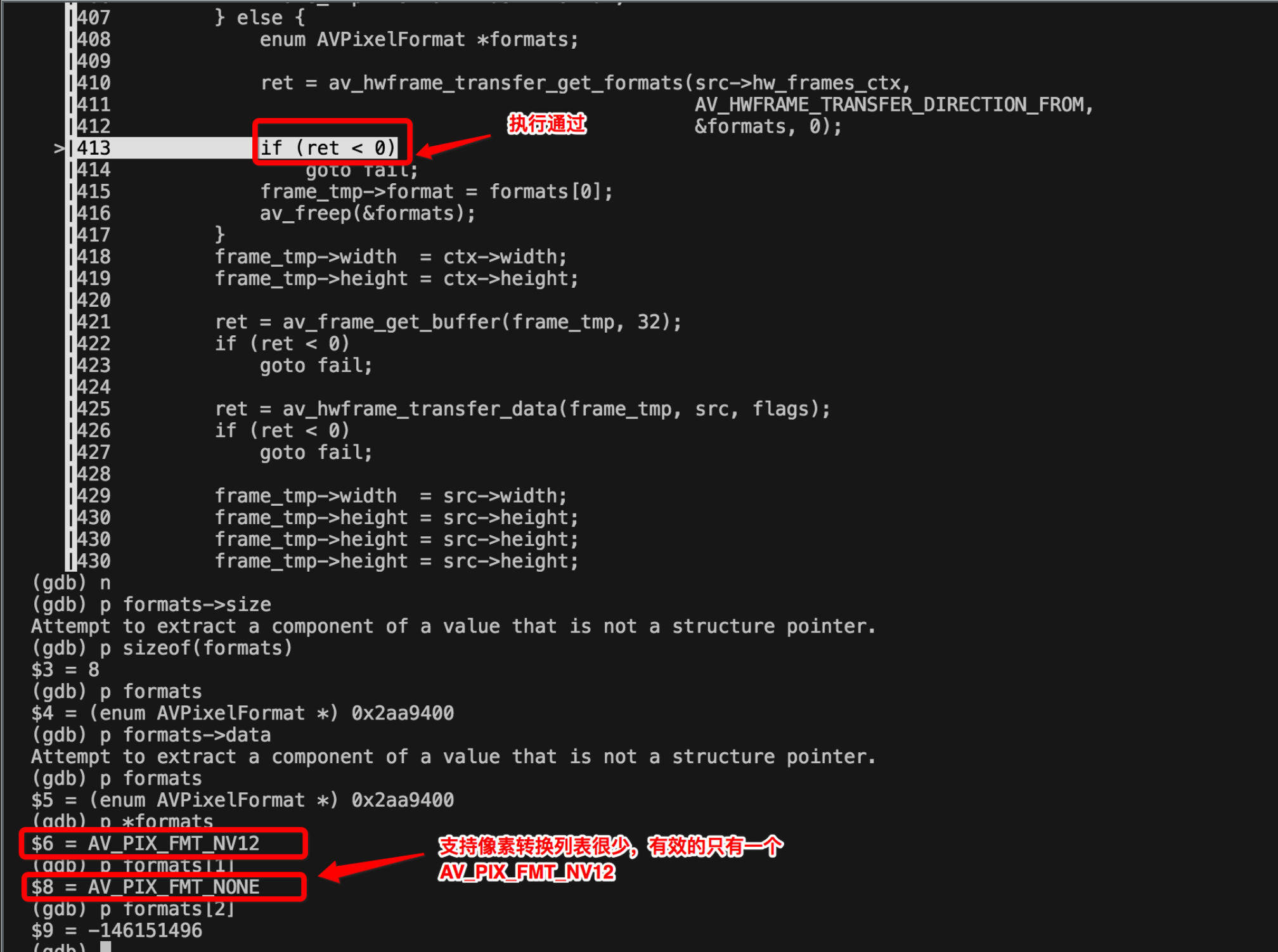 红框表示的意思为:src->frame->format 转换为 dst->frame->format 是受限制的,主要是受av_hwframe_transfer_get_formats() 函数返回的formats 列表限制所以gdb了下源码,发现src->frame->format 转换为 dst->frame->format 的受限范围很小,然后找出了 av_hwframe_transfer_get_formats 支持的formats,