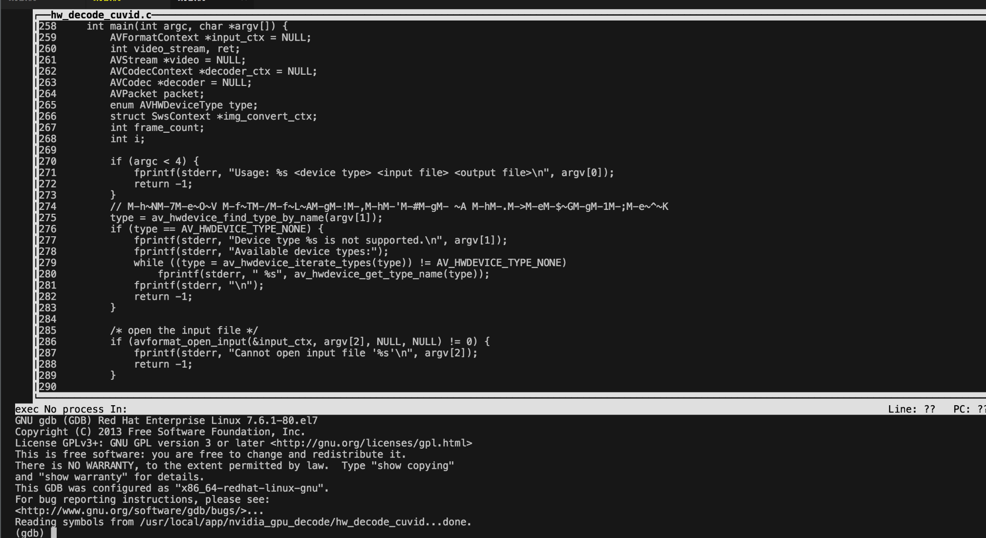 调试过程如下所示:gdb -tui hw_decode_cuvid (-tui 支持查看源码)