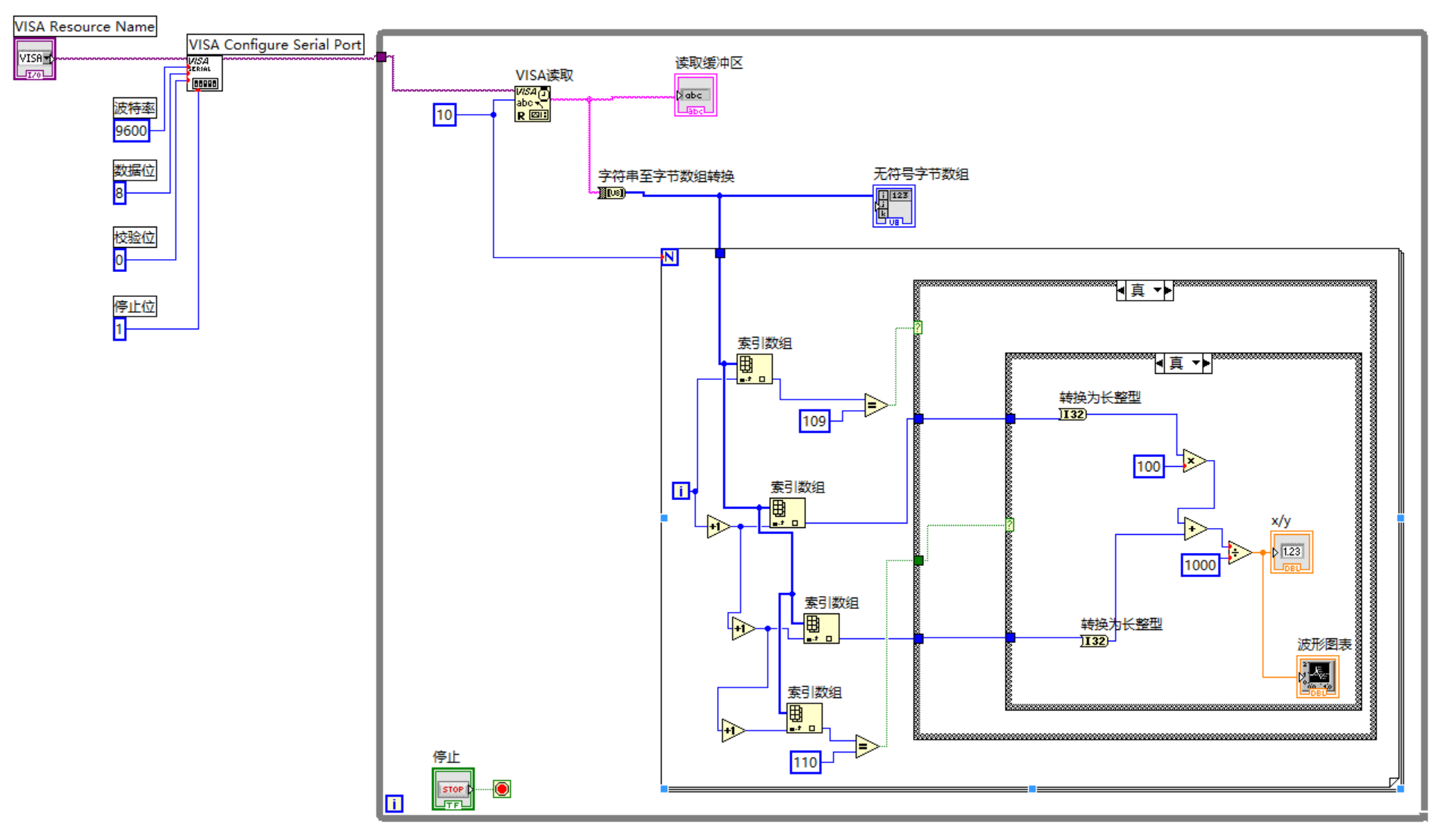 读取缓冲区字节数,读到字节数,就确定了 VISA 读取里面那个字节数,然后用读取 VISA 读出来。意思就是,前面的先侦测下串口缓冲区有多少数据,侦测完了就告诉 VISA 读, VISA就全读出来;