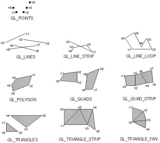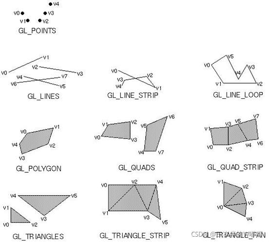 按下图所示依次绘制出10种基本图元的图形,开启点、线、多边形抗锯齿,并且绘制多边形时在不同顶点指定不同颜色使多边形呈渐变色彩。