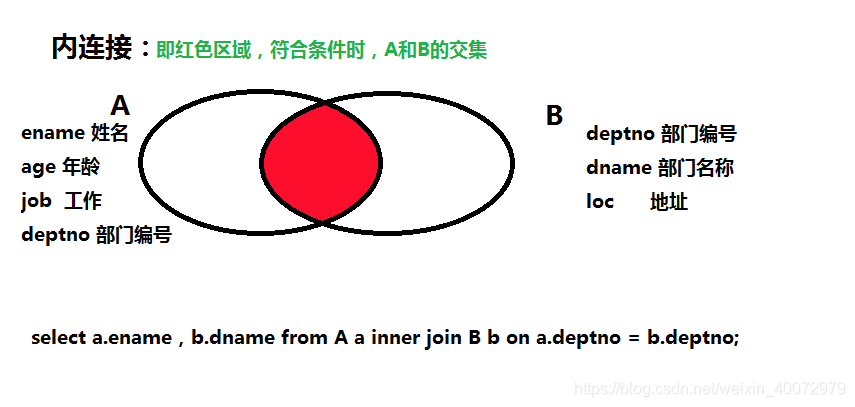 一:首先说内连接:内连接就是两个表的交集,符合条件的两表共同的数据:如下图