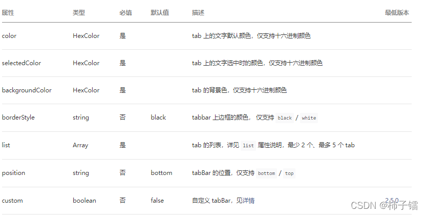 其中 list 接受一个数组,只能配置最少 2 个、最多 5 个 tab。tab 按数组的顺序排序,每个项都是一个对象,其属性值如下: