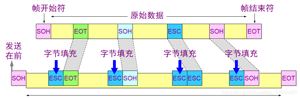 - 发送端的数据链路层在数据中出现控制字符“SOH"或“EOT”的前面插入一个转义字符“ESC"(其十六进制编码是1B)。