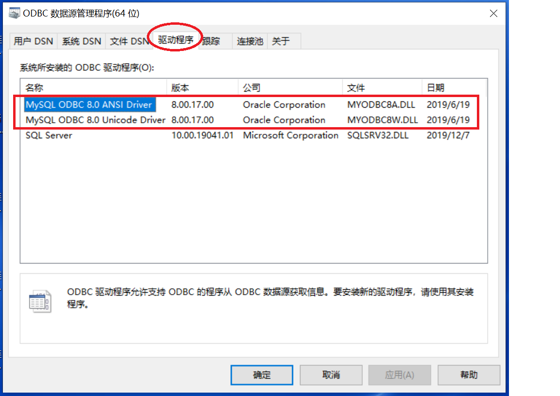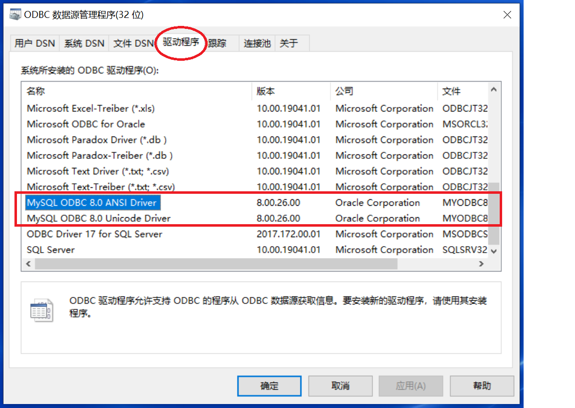 如果在【ODBC数据源管理程序(32位)】的【驱动程序】选项卡中可以看到MySQL ODBC驱动程序,说明MySQL ODBC 32位驱动程序安装成功。