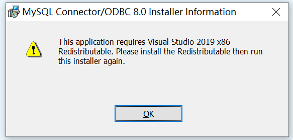 从甲骨文公司网站下载32位的Connector/ODBC安装程序(mysql-connector-odbc-8.0.26-win32.msi),安装时弹出下面的错误提示。