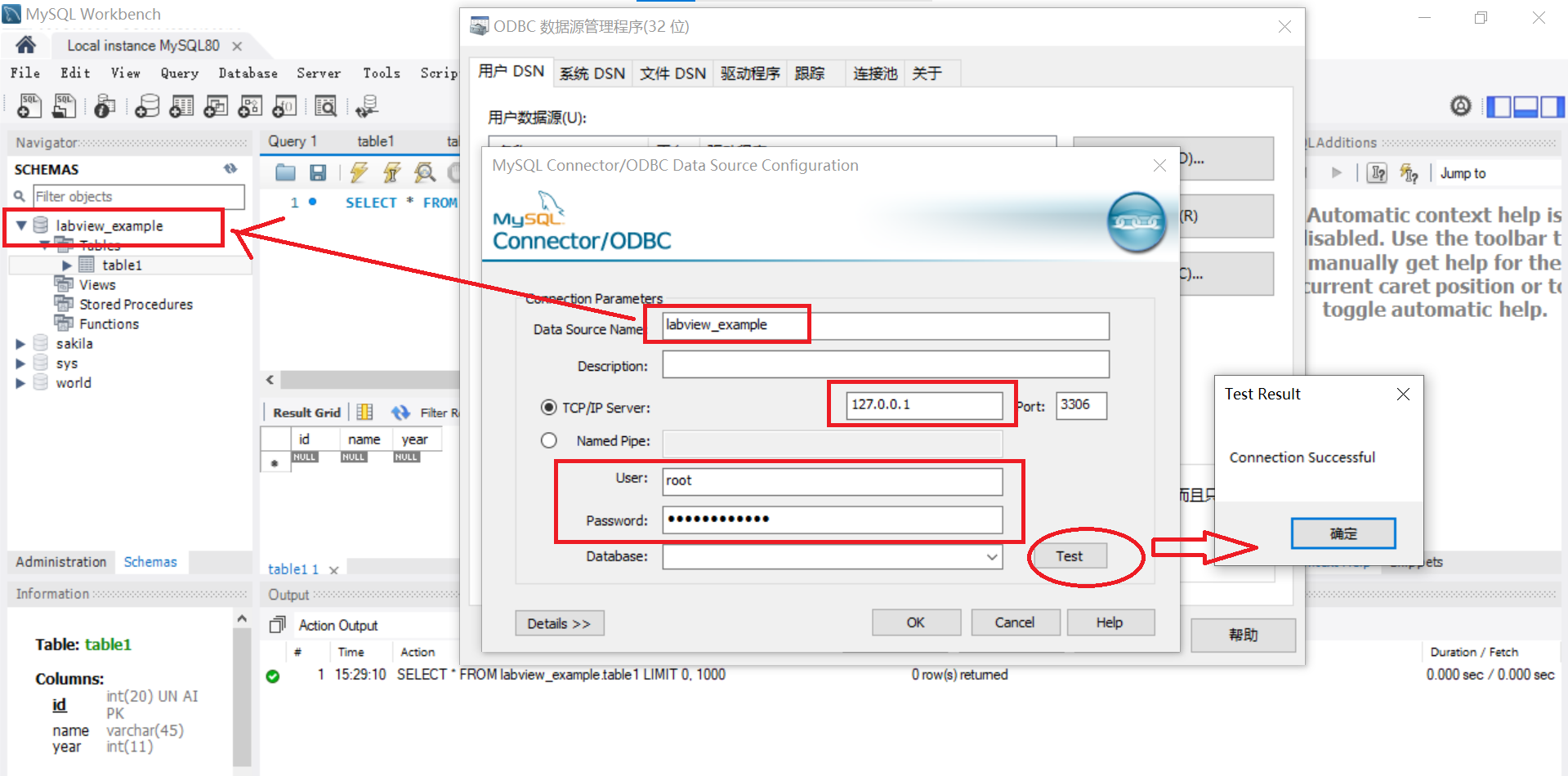 Data Source Name:你的数据库名(数据库名为labview_example)
